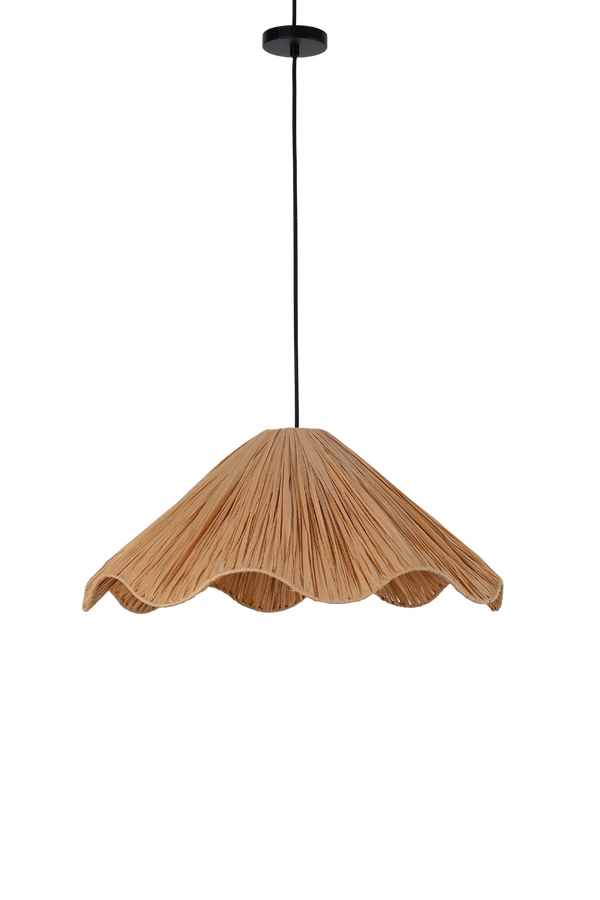 Подвесной светильник с декоративным абажуром из рафии и бумаги, создающий мягкое тёплое освещение и уютную атмосферу. Необычная волнистая форма абажура придаёт интерьеру лёгкость и стиль.