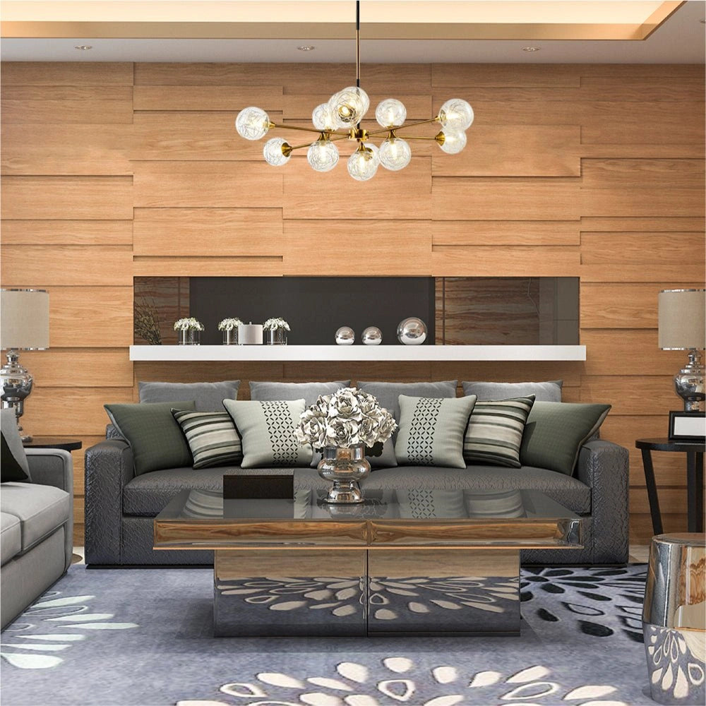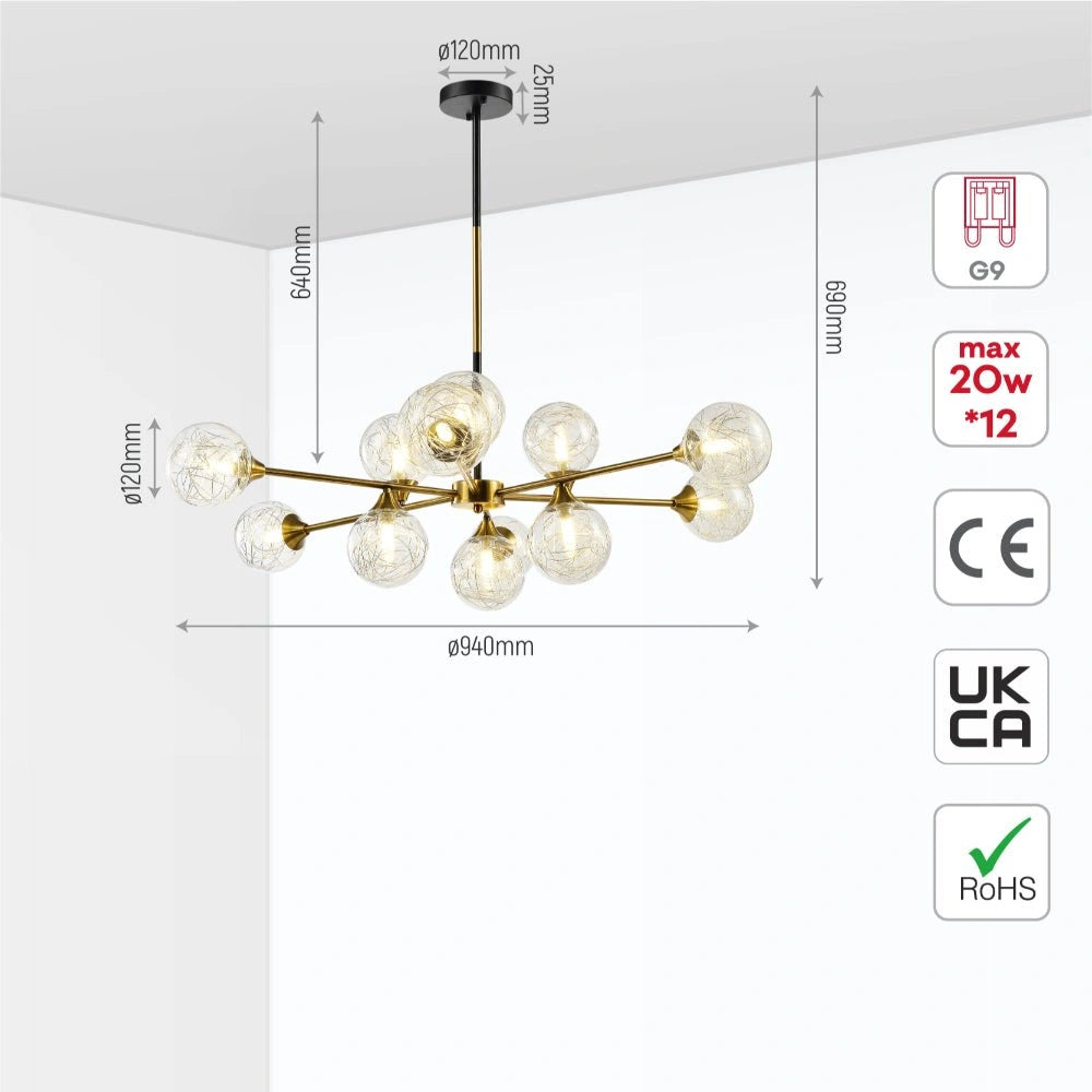 Мөлдір шыны глобус және 12xG9 ұстағыштары бар алтын металл люстра