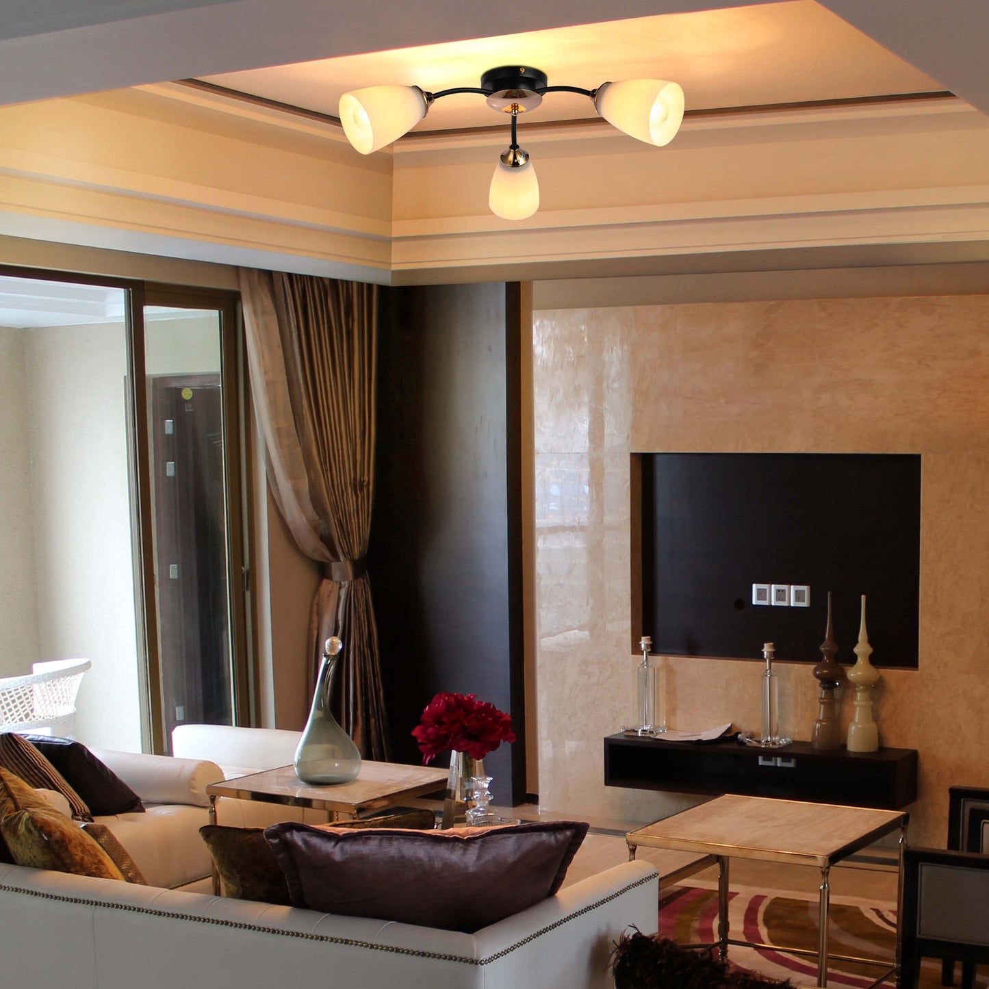 Люстра отлично впишется в интерьеры в стилях лофт, индустриальный, минимализм или скандинавский. Благодаря потолочному креплению модель удобно использовать в помещениях с ограниченной высотой потолков.