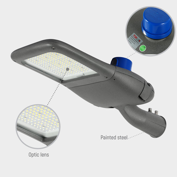 Обтекаемый корпус серого (GREY) цвета, выполненный из прочного материала (вероятно, алюминия), обеспечивает эффективный теплоотвод и защиту. Высокий класс защиты IP65 (стандарт для уличного освещения) гарантирует, что светильник полностью устойчив к пыли и сильным водяным струям. Консольное крепление (видно на изображении) обеспечивает простой монтаж на столбы.